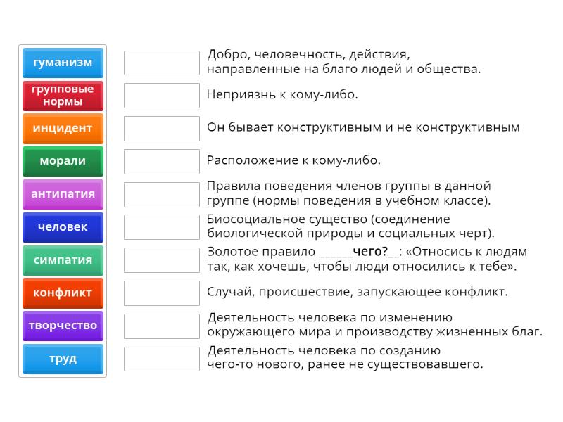 человек - Биосоциальное существо (соединение биологической природы и социальных черт)., труд - Деятельность человека по изменению окружающего мира и производству жизненных благ., творчество - Деятельность человека по созданию чего-то нового, ранее не существовавшего., антипатия - Неприязнь к кому-либо., симпатия - Расположение к кому-либо., групповые нормы - Правила поведения членов группы в данной группе (нормы поведения в учебном классе)., конфликт - Он бывает конструктивным и не конструктивным, гуманизм - Добро, человечность, действия, направленные на благо людей и общества., морали - Золотое правило ______чего?__: «Относись к людям так, как хочешь, чтобы люди относились к тебе»., инцидент - Случай, происшествие, запускающее конфликт.,