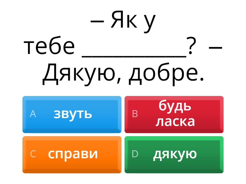 1) – Як у тебе __________? – Дякую, добре. a) звуть b) будь ласка c) справи d) дякую 2) Вибачте, де тут готель? – Ось ______, праворуч. a) він b) вона c) воно d) вони 3) ______ звуть Олена і Марія. a) Її b) Їх c) Мене d) Тебе e) Його 4) – ______ він за професією? – Він лікар. a) Що b) Чому c) Хто d) Як e) Де 5) – Павло, Ви працюєте? – Так, я вчитель. - Я _____ вчитель. – Леонид, Вы ____________ работаете? – Нет, я студент a) ще b) також c) будь ласка d) тільки 6) Тридцять додати сімдесят дорівнює _________________________. a) тридцять сім b) сорок c) сто  7) __________ це зошит?  a) Чия b) Чий c) Чиє d) Чиї 8) Я готую _______________________________________. a) риба і салат b) рибу і салат c) рибі і салат 9) Вона вивчає _________________________. a) піццу b) телевізор c) медицину d) комп'ютер 10) Малювання — _______ хобі. a) мій b) моя c) моє d) мої 11) Я не сплю, тому що сусіди дуже __________________ розмовляють. a) темно b) повільно c) голосно d) сонячно 12) Ліжко — це меблі, які стоять в __________________ . a) спальні b) вітальні c) гаражі d) коридорі 13) На стіні __________________ наша фотографія. a) сидить b) лежить c) висить d) спить e) стоїть 14) Мені _____________________ писати книжки. a) люблю b) подобається c) подобаються d) займаюся 15) Він ________ читає лекцію. a) цікаво b) низько c) високо d) завтра e) вчора 16) На сніданок я __________ млинці з варенням. a) п'ю b) снідаю c) їм d) обідаю e) вечеряю 17) Мій брат не може __________ без кави. a) жити b) пити c) їсти d) ходити e) сидіти 18) ___________ ти зателефонував? a) хто b) на кому c) що d) кого e) кому 19) Я придбала в магазині _________________ хліб. a) добрий b) веселий c) давній d) смачний 20) Я зараз не __________________ говорити, я біжу на роботу. a) можна b) заборонено c) можу d) потрібно e) треба f) необхідно 21) Ти _______________________ в Интернеті чи в газеті? a) купуєш продукти b) сидиш c) читаєш новини 22) В театрі йде чудова _____________________. a) вистава b) книга c) газета d) історія e) шоу f) спектакль 23) Мама купує продукти ______ ринку. a) у b) в c) на d) під e) між f) біля 24) Привіт, куди ти __________________? – В музей. a) йдуть b) йду c) йдемо d) йдеш e) йде f) йдете 25) – _________________ він йде? — Він йде з роботи. a) звідки b) куди c) де 26) Я щороку дарую ______________ новий парфум. a) їй b) її c) вона d) ній 27) __________ важко вчити англійську мову a) я b) вона c) її  d) його e) ти f) мені 28) Студенти йдуть в __________ . a) університеті b) університету c) університет 29) — _______ ти йдеш? — Я йду на заняття з тенісу. a) звідки b) де c) куди 30) ____________ країною — мрія Саші. a) бігати b) купатися c) ходити d) подорожувати e) купувати