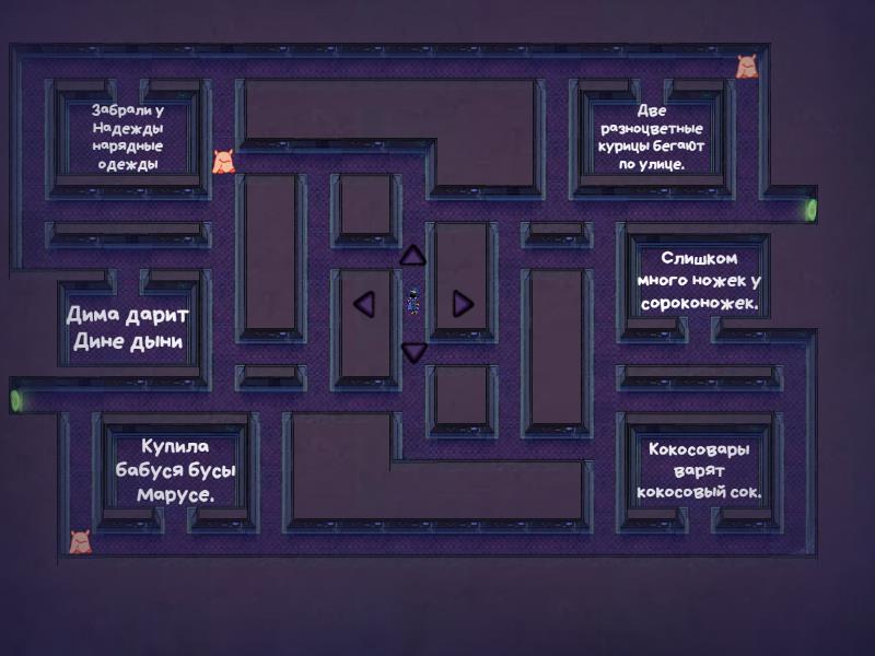 1) Пройди лабиринт-прочти скороговорки чётко и быстро a) Забрали у Надежды нарядные одежды b) Купила бабуся бусы Марусе. c) Две разноцветные курицы бегают по улице. d) Кокосовары варят кокосовый сок. e) Дима дарит Дине дыни f) Слишком много ножек у сороконожек.