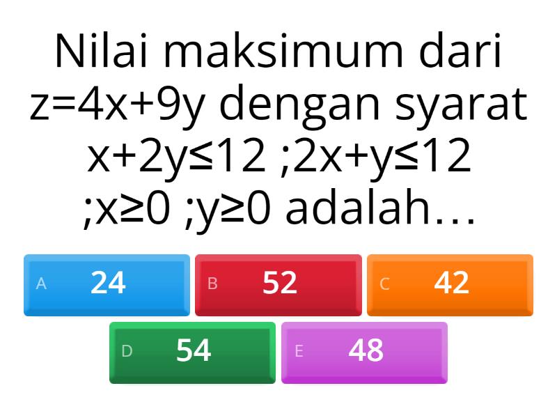 1) Nilai maksimum dari z=4x+9y dengan syarat x+2y≤12 ;2x+y≤12 ;x≥0 ;y≥0 adalah… a) 24 b) 52 c) 42 d) 54 e) 48 2) Grafik tersebut merupakan model... a) Batang b) Garis c) Grafik d) Pie Chart e) Pie 3) Nilai minimum dari 5x+4y pada daerah himpunan penyelesaian berikut adalah… a) 8 b) 12 c) 10 d) 13 e) 11 4) Matriks A=[■(a&4@2b&3c)] dan B=[■(2c-3b&2a+1@a&b+7)]. Supaya dipenuhi A=2B^T,dengan B^T menyatakan matriks transpose dari B, maka nilai c =… a) 2 b) 8 c) 3 d) 10 e) 5 5) Pak Andri mengelola jasa parkir dengan daerah parkir seluas 480 m^2 yang hanya dapat menampung maksimum 40 mobil. Setiap mobil kecil membutuhkan tempat parkir 8m^2 dengan biaya parkir Rp.4.500,00/jam dan setiap mobil besar membutuhkan tempat parkir 24m^2 dengan biaya parkir Rp.7.000,00/jam. Jika dalam satu jam tidak ada kendaraan yang keluar dan masuk, pendapatan maksimum jasa tempat parkir adalah… a) Rp.140.000,00   b) Rp.205.000,00   c) Rp.280.000,00 d) Rp. 210.000.00 e) Rp 180.000.00