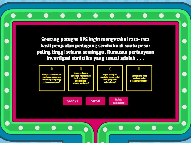 1) Seorang petugas BPS ingin mengetahui rata-rata hasil penjualan pedagang sembako di suatu pasar paling tinggi selama seminggu. Rumusan pertanyaan investigasi statistika yang sesuai adalah . . . a) Berapa rata-rata hasil penjualan pedagang sembako paling tinggi selama seminggu? b) Kapan pedagang sembako memperoleh hasil penjualan paling tinggi selama seminggu? c) Kapan pedagang sembako memperoleh hasil penjualan paling tinggi? d) Berapa rata-rata hasil penjualan pedagang sembako? 2) Jika ingin mengetahui tinggi badan siswa di kelas X yang paling banyak. Maka data yang dikumpulkan adalah . . . a) Data tinggi badan setiap siswa di kelas X b) Data siswa di kelas X yang belum diukur tinggi badannya c) Data nama siswa yang di kelas X yang akan diukur tinggi badannya d) Data banyak siswa di kelas X yang telah diukur tinggi badannya 3) Data luas wilayah kabupaten / kota dapat diperoleh dengan cara . . . a) Eksperimen b) Wawancara c) observasi d) Studi dokumen 4) Data berikut yang merupakan data numerik adalah . . . a) Data berat badan siswa b) Biodata siswa c) Data mata Pelajaran yang disukai d) Data Tingkat kepuasan nasabah 5) Data berikut yang merupakan data kategorik adalah . . . a) Data Data suhu udara di suatu tempat setiap jam dalam sehari b) Data banyak siswa di setiap kelas c) Data berat badan siswa d) Biodata siswa 6) Perhatikan gambar tersebut! Banyaknya panen singkong adalah . . . a) 500 kg b) 340 kg c) 400 kg d) 600 kg 7) Perhatikan data tersebut! Banyak siswa kelas 9 SMP Bina Nusa adalah . . . a) 58 orang b) 59 orang c) 61 orang d) 60 orang 8) Perhatikan gambar berikut! Jumlah siswa yang beratnya 42 kg adalah . . . a) 18 orang b) 16 orang c) 15 orang d) 14 orang 9) Perhatikan gambar berikut! Jumlah seluruh siswa adalah . . . a) 59 orang b) 58 orang c) 60 orang d) 61 orang 10) Perhatikan gambar berikut!Berat badan yang paling banyak dimiliki siswa adalah . . . a) 43 kg b) 42 kg c) 40 kg d) 44 kg 11) Perhatikan gambar berikut! Diagram berikut menjelaskan kegemaran sekelompok siswa terhadap mata pelajaran di sekolah. Dalam kelompok tersebut terdapat 10 siswa yang gemar matematika. Jumlah siswa dalam kelompok tersebut adalah . . . a) 75 orang b) 70 orang c) 76 orang d) 80 orang 12) Perhatikan gambar berikut! Banyak siswa yang gemar Bahasa Indonesia adalah . . . a) 11 orang b) 22 orang c) 9 orang d) 18 orang 13) Untuk membandingkan perolehan medali emas setiap negara, sebaiknya disajikan dalam bentuk . . . a) Diagram garis majemuk b) d. Diagram batang majemuk c) Diagram garis Tunggal d) Diagram batang Tunggal 14) Kepala sekolah ingin mengetahui persentase siswa kelas VII, VIII dan IX yang melanggar tata tertib sekolahterhadap seluruh siswa yang melanggar tata tertib sekolah. Tim panitia khusus sebaiknya menyajikan data dalam bentuk . . . a) Diagram garis majemuk b) diagram lingkaran c) Diagram batang Tunggal d) Diagram batang majemuk 15) Untuk membandingkan perolehan medali emas, perak, dan perunggu setiap negara sebaiknya disajikan dalam bentuk . . . a) Diagram garis Tunggal b) Diagram garis majemuk c) Diagram batang majemuk d) Diagram batang Tunggal