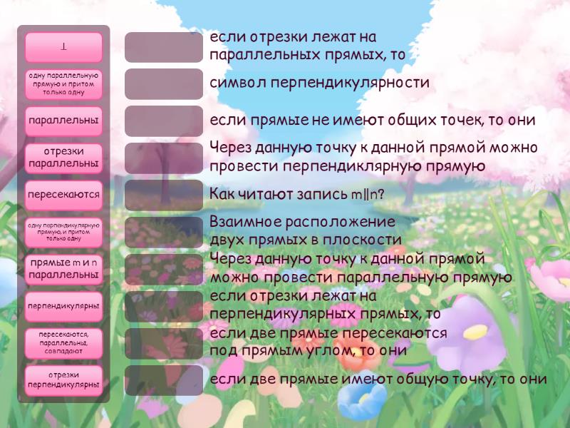 пересекаются, параллельны, совпадают - Взаимное расположение двух прямых в плоскости, перпендикулярны - если две прямые пересекаются под прямым углом, то они , пересекаются - если две прямые имеют общую точку, то они , параллельны - если прямые не имеют общих точек, то они, ⊥ - символ перпендикулярности, отрезки параллельны - если отрезки лежат на параллельных прямых, то , отрезки перпендикулярны - если отрезки лежат на перпендикулярных прямых, то , прямые m и n параллельны - Как читают запись m∥n?, одну перпендикулярную прямую, и притом только одну - Через данную точку к данной прямой можно провести перпендиклярную прямую, одну параллельную прямую и притом только одну - Через данную точку к данной прямой можно провести параллельную прямую,