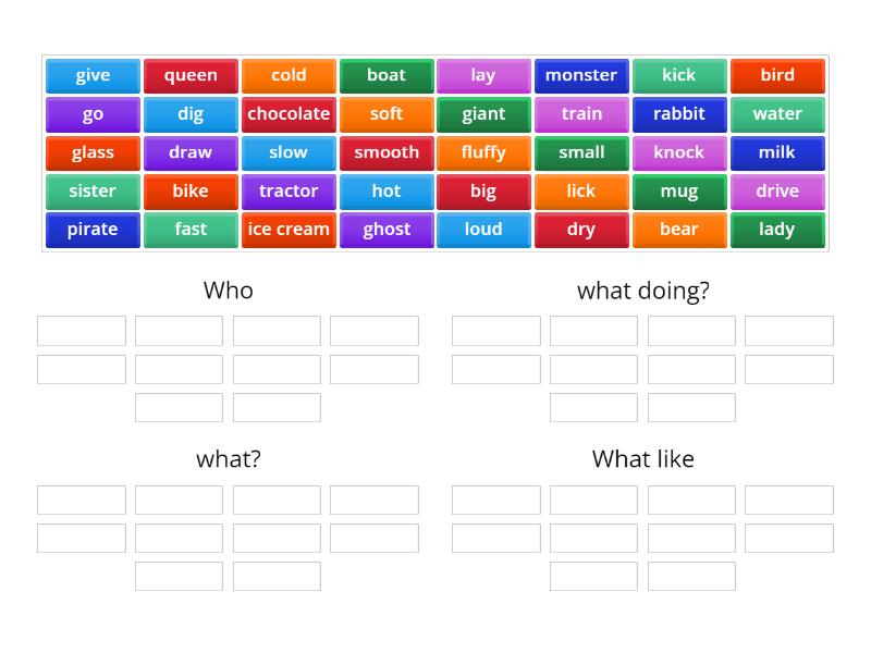 Who: bird, sister, lady, monster, queen, ghost, pirate, giant, bear, rabbit, what doing?: drive, draw, dig, lay, knock, kick, dry, go, lick, give, what?: mug, milk, water, bike, tractor, chocolate, train, ice cream, boat, glass, What like: big, small, loud, soft, smooth, hot, cold, fluffy, slow, fast,