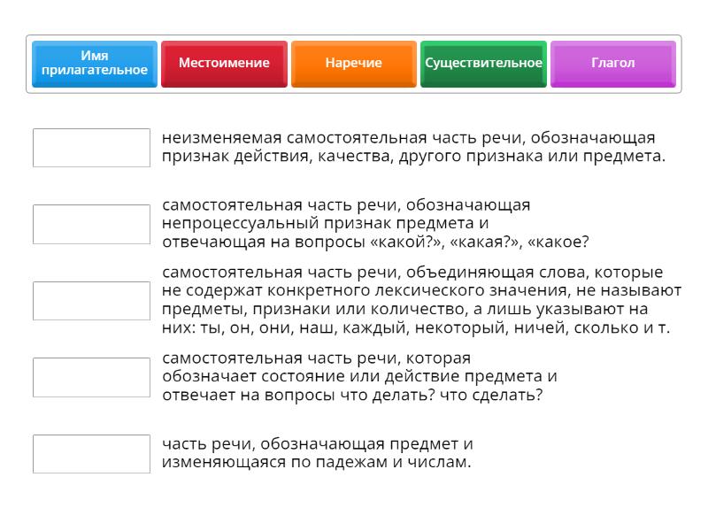 Местоимение - самостоятельная часть речи, объединяющая слова, которые не содержат конкретного лексического значения, не называют предметы, признаки или количество, а лишь указывают на них: ты, он, они, наш, каждый, некоторый, ничей, сколько и т., Глагол - самостоятельная часть речи, которая обозначает состояние или действие предмета и отвечает на вопросы что делать? что сделать?, Существительное - часть речи, обозначающая предмет и изменяющаяся по падежам и числам., Наречие - неизменяемая самостоятельная часть речи, обозначающая признак действия, качества, другого признака или предмета., Имя прилагательное - самостоятельная часть речи, обозначающая непроцессуальный признак предмета и отвечающая на вопросы «какой?», «какая?», «какое?,