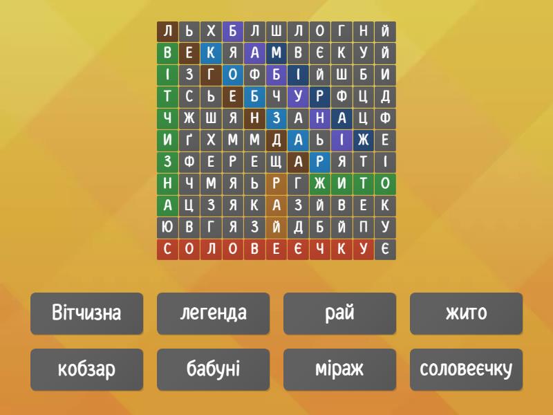 жито - жито, бабуні - бабуні, соловеєчку - соловеєчку, кобзар - кобзар, легенда - легенда, міраж - міраж, рай - рай, Вітчизна - Вітчизна,
