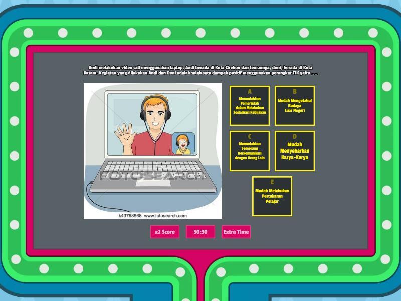 1) Andi melakukan video call menggunakan laptop. Andi berada di Kota Cirebon dan temannya, doni, berada di Kota Batam. Kegiatan yang dilakukan Andi dan Doni adalah salah satu dampak positif menggunakan perangkat TIK yaitu .... a) Memudahkan Pemerintah dalam Melakukan Sosialisasi Kebijakan b) Mudah Mengetahui Budaya Luar Negeri c) Memudahkan Seseorang Berkomunikasi dengan Orang Lain d) Mudah Menyebarkan Karya-Karya e) Mudah Melakukan Pertukaran Pelajar 2) Di sekolah Guru menampilkan soal-soal latihan dengan menggunakan aplikasi Quizziz, Kahoot, Worldwall, dll.. Aplikasi-aplikasi tersebut sangat disenangi oleh siswa. Hal tersebut merupakan dampak positif dalam memanfaatkan Internet (TIK) yaitu .... a) Memudahkan Pemerintah dalam Melakukan Sosialisasi Kebijakan b) Mudah Mengetahui Budaya Luar Negeri c) Memudahkan Seseorang Berkomunikasi dengan Orang Lain d) Media pembelajaran yang menyenangkan e) Depresi dan kecemasan 3) Perhatikan beberapa kemudahan terkait teknologi informasi berikut. Teknologi informasi memberikan kemudahan dalam membuka usaha. Penyebab yang benar ditunjukkan oleh nomor….. a) (1) dan (2) b) (1) dan (3) c) (1) dan (4) d) (1), (2), (3) dan (4) e) (1), (2), dan (3) 4) Keuntungan pemanfaatan komputer dalam bidang pendidikan bagi pelajar yaitu….. a) Mendorong proses demokrasi b) Memudahkan perusahaan dalam layanan pengiriman c) Memperoleh sumber ilmu pengetahuan dengan bena d) Meningkatkan transparansi (keterbukaan) dalam pemerintah e) Menciptakan lapangan kerja 5) Apabila ada seseorang menelepon dan meminta data pribadi kita, hal-hal yang dapat dilakukan sebagai berikut, kecuali ….. a) Menanyakan alasan permintaan data b) Hubungi nomor resmi layanan konsumen untuk info lebih lanjut c) Cek nomor penelepon, apakah nomor resmi atau bukan d) Tutup telepon jika meragukan e) Beri data yang diminta penelepon 6) Teknologi berikut yang tidak memberikan peranan dalam meningkat interaksi sosial antara penggunanya adalah…. a) Line b) Facebook c) Instagram d) WhatsApp e) Microsoft Word 7) Dampak negatif Teknologi Informasi dan komunikasi (TIK) dalam bidang Pendidikan, kecuali..... a) Program – program tes akan mudah sekali bocor ke publik b) Informasi yang dibutuhkan untuk menjadi lebih cepat dan lebih mudah dalam mengakses tujuan pendidikan c) Orang – orang tidak bertanggung jawab melakukan kejahatan seperti perubahan nilai ujian peserta d) Plagiat/contek/meniru dan melakukan kecurangan akan sangat mudah e) Semangat belajar menjadi berkurang tergantikan dengan bermain media social favorit 8) Berita Hoaks merupakan salah satu contoh dampak negatif dalam dampak sosial informatika yang termasuk kedalam... a) Dis-Informasi b) “Penjajahan” Budaya c) Terciptanya Anti Sosial d) Ujaran Kebencian e) Munculnya Kriminalitas atau Cyber Crime 9) kejahatan dengan menggunakan teknologi komputer untuk kemudian melakukan transaksi dengan menggunakan kartu kredit orang lain sehingga kemudian merugikan baik secara material maupun nonmaterial. Termasuk jenis dampak negatif sosial informatika dengan istilah... a) Phishing b) Carding c) CyberBullying d) Hacking e) Cracking 10) Berikut ini beberapa dampak negative dari teknologi informasi, kecuali.. a) Malas bersosialisasi secara fisik b) Menurunnya prestasi belajar dan kemampuan bekerja seseorang c) Menjauhkan yang dekat d) Mempermudah pertukaran file e) Meningkatkannya kejahatan dunia maya