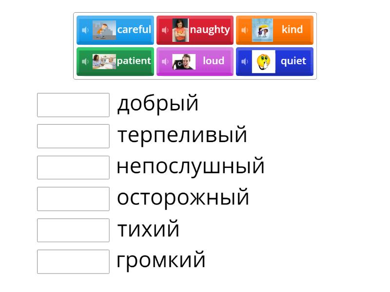 careful - осторожный, kind - добрый, loud - громкий, naughty - непослушный, patient - терпеливый, quiet - тихий,