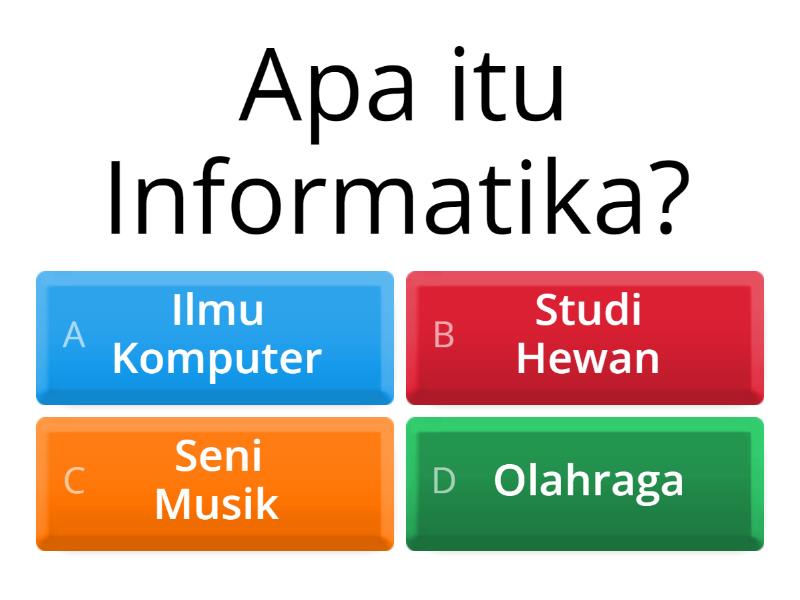 1) Apa itu Informatika? a) Ilmu Komputer b) Studi Hewan c) Seni Musik d) Olahraga 2) Dampak positif Informatika? a) Kemudahan Akses b) Isolasi Sosial c) Peningkatan Efisiensi d) Polusi Suara 3) Dampak negatif Informatika? a) Pekerjaan Hilang b) Koneksi Global c) Kecanduan Internet d) Pengetahuan Baru 4) Contoh Informatika dalam pendidikan? a) E-Learning b) Buku Tulis c) Papan Tulis d) Kelas Virtual 5) Alat yang digunakan dalam Informatika? a) Komputer b) Palu c) Sekop d) Smartphone 6) Media sosial adalah hasil dari? a) Informatika b) Biologi c) Geografi d) Matematika 7) Informatika membantu dalam? a) Komunikasi b) Pertanian c) Transportasi d) Pendidikan 8) Kecerdasan buatan termasuk dalam? a) Informatika b) Psikologi c) Sosiologi d) Antropologi 9) Informatika mempengaruhi? a) Gaya Hidup b) Tradisi c) Interaksi Sosial d) Pekerjaan 10) Privasi data terancam oleh? a) Keamanan Siber b) Hacker c) Antivirus d) Firewall
