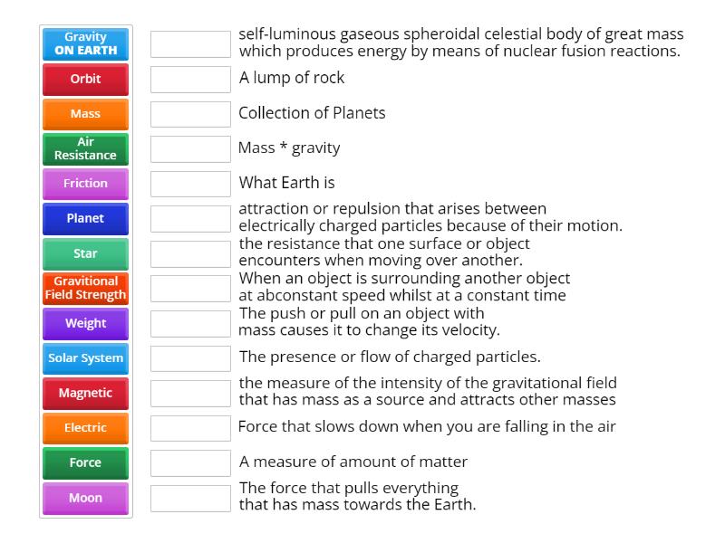 Force - The push or pull on an object with mass causes it to change its velocity., Gravity ON EARTH - The force that pulls everything that has mass towards the Earth., Electric - The presence or flow of charged particles., Magnetic - attraction or repulsion that arises between electrically charged particles because of their motion., Friction - the resistance that one surface or object encounters when moving over another., Air Resistance - Force that slows down when you are falling in the air, Planet - What Earth is, Moon - A lump of rock, Star - self-luminous gaseous spheroidal celestial body of great mass which produces energy by means of nuclear fusion reactions., Solar System - Collection of Planets, Orbit - When an object is surrounding another object at abconstant speed whilst at a constant time, Mass - A measure of amount of matter, Weight - Mass * gravity, Gravitional Field Strength - the measure of the intensity of the gravitational field that has mass as a source and attracts other masses,