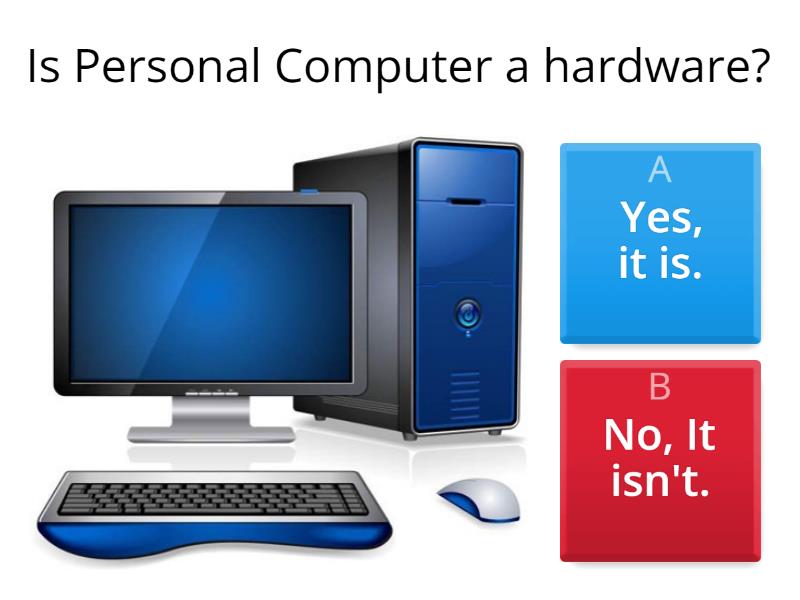 1) Is Personal Computer a hardware? a) Yes, it is. b) No, It isn't. 2) Which one is correct about hardware? a) We can touch it. b) We can't touch it. 3) It is maden by algorithm a) Software b) Hardware c) Program 4) Power point a) Software b) Hardware 5) mouse a) We can hold it. b) It is a physical part of computer. c) It is software 6) google a) We can touch it b) It is a hardware c) It is a software 7) Is keyboard a hardware? a) No, it isn't b) Yes, it is