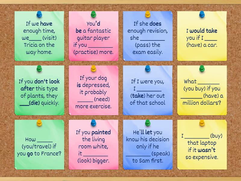If we have enough time, we____ (visit) Tricia on the way home. - If we have enough time, we'll visit Tricia on the way home (cond 1), You’d be a fantastic guitar player if you ________ (practise) more. - You’d be a fantastic guitar player if you practised more. (cond 2), If she does enough revision, she ________ (pass) the exam easily. - If she does enough revision, she'll pass the exam easily. (cond 1), I would take you if I ____ (have) a car. - I would take you if I had a car. (cond 2), If you don't look after this type of plants, they ___(die) quickly. - If you don't look after this type of plants, they die quickly (cond 0), If your dog is depressed, it probably _____ (need) more exercise. - If your dog is depressed, it probably needs more exercise (cond 0), If I were you, I ________ (take) her out of that school - If I were you, I'd take her out of that school (cond 2), What _______ (you buy) if you _______ (have) a million dollars? - What would you buy if you had a million dollars? (cond 2), How _____ (you/travel) if you go to France? - How will you travel if you go to France? (cond 1), If you painted the living room white, it ________ (look) bigger. - If you painted the living room white, it'd look bigger. (cond 2), He’ll let you know his decision only if he ________ (speak) to Sam first. - He’ll let you know his decision only if he speaks to Sam first. (cond 1), I ________ (buy) that laptop if it wasn’t so expensive. - I'd buy that laptop if it wasn’t so expensive. (cond 2),