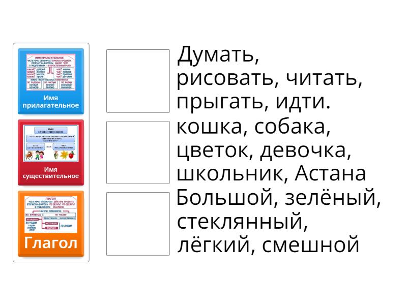 Имя существительное - кошка, собака, цветок, девочка, школьник, Астана, Имя прилагательное - Большой, зелёный, стеклянный, лёгкий, смешной, Глагол - Думать, рисовать, читать, прыгать, идти.,