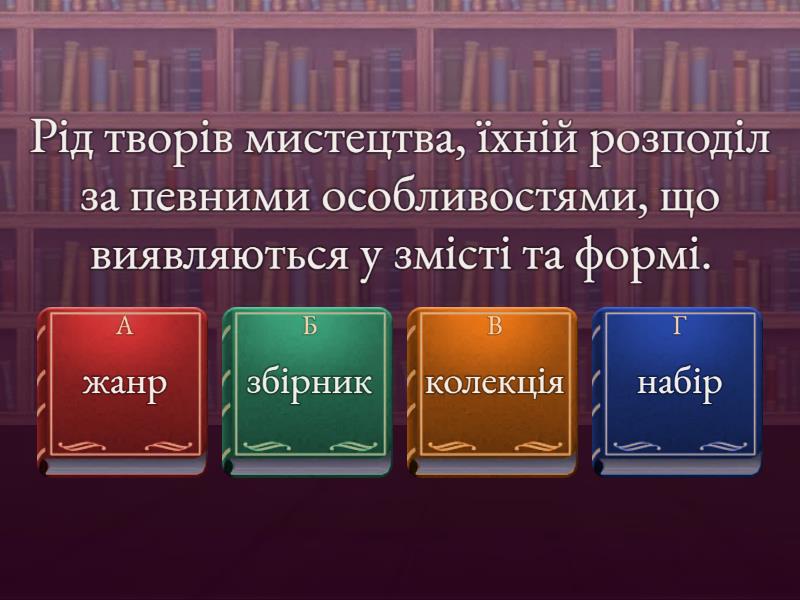 1) Рід творів мистецтва, їхній розподіл за певними особливостями, що виявляються у змісті та формі. a) жанр b) збірник c) колекція d) набір 2) Урочистий музичний твір на слова символічно- програмного змісту, головна пісня держави. a) ода b) гімн c) романс d) балада 3) Твори для невеликого складу виконавців — співаків або інструменталістів a) кімнатна музика b) індивідуальна музика c) камерна музика d) музика для товаришів 4) Вокальний ліричний твір для голосу з інструментальним супроводом називають a) романсом b) вокалізом c) піснею d) розспівкою 5) Вокальний або інструментальний твір романтичного змісту, насичений яскравими, часто фантастичними образами a) романс b) балада c) ноктюрн d) гімн 6) Жанр вокально-хорової музики; великий твір для хору, соліста й оркестру a) кантата b) соната c) елегія d) ораторія 7) Керівник хорового колективу, диригент хору a) соліст b) хормейстр c) балетмейстр d) композитор 8) Хоровий спів без інструментального супроводу a) вокаліз b) партесний c) a capella d) знаменний 9) Великий концертний твір на певний сюжет, частіше церковний. a) літургія b) симфонія c) кантата d) ораторія 10) Жанр камерно-інструментальної музики; п’єса вільного, імпровізаційного характеру. a) етюд b) фантазія c) прелюдія d) ноктюрн 11) Спокійні мелодійні п'єси задумливого характеру, навіяні поетичним настроєм ночі a) ноктюрн b) романс c) фантазія d) балада