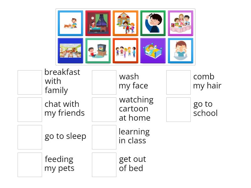 get out of bed, wash my face, comb my hair, breakfast with family, go to school, learning in class, watching cartoon at home, feeding my pets, chat with my friends, go to sleep,