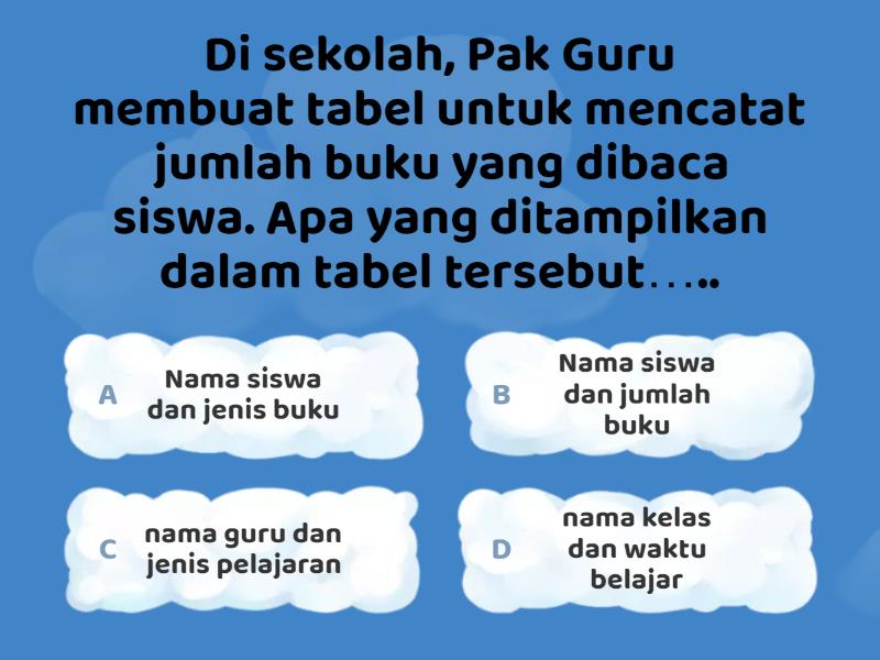 1) Di sekolah, Pak Guru membuat tabel untuk mencatat jumlah buku yang dibaca siswa. Apa yang ditampilkan dalam tabel tersebut….. a) Nama siswa dan jenis buku b) Nama siswa dan jumlah buku c) nama guru dan jenis pelajaran d) nama kelas dan waktu belajar 2) Berikut adalah tabel tentang jenis-jenis binatang peliharaan teman-teman di kelas. Jenis binatang yang paling banyak dari tabel di bawah adalah...... a) kelinci b) kucing c) anjing d) kucing dan kelinci 3) Dalam tabel berikut, berapa jumlah total sayuran yang dibawa oleh teman-teman ............ a) 10 b) 16 c) 18 d) 20 4) Jika tabel menunjukkan warna favorit siswa, mana yang paling jarang dipilih adalah ............. a) ungu b) Kuning c) biru d) hijau 5) Makanan yang paling disukai oleh Meli adalah………… a) soto b) mie c) sate d) nasi goreng