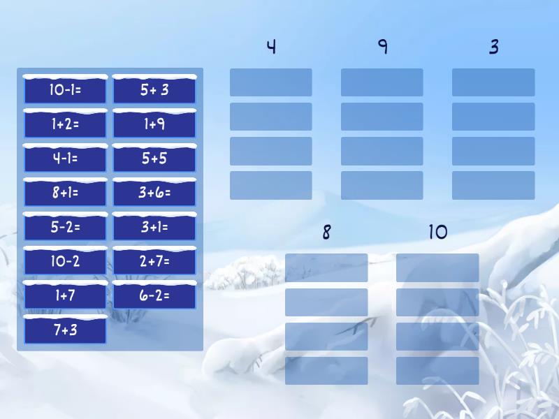 4: 3+1=, 6-2=, 4+0=, 10-6=, 9: 2+7=, 3+6=, 10-1=, 8+1=, 3: 1+2=, 5-2=, 4-1=, 10-7=, 8: 5+ 3, 10-2, 1+7, 0+8=, 10: 5+5, 1+9, 7+3, 6+4=,