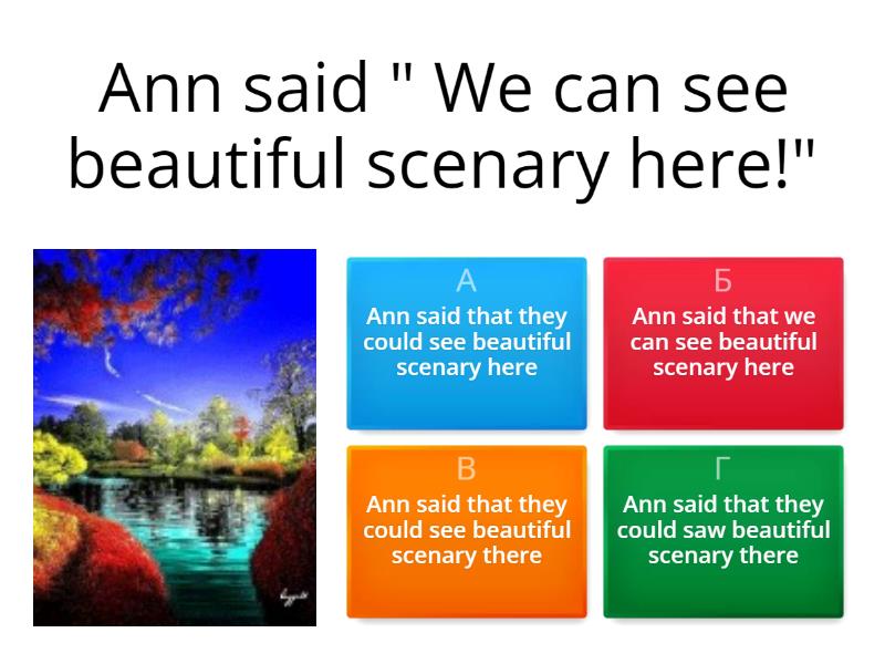 1) Ann said " We can see beautiful scenary here!" a) Ann said that they could see beautiful scenary here b) Ann said that we can see beautiful scenary here c) Ann said that they could see beautiful scenary there d) Ann said that they could saw beautiful scenary there 2) Nick said to Ann " Your face is so attractive" a) Nick said to Ann that your face was so attractive b) Nick said to Ann that her face was so attractive c) Nick said to Ann that her face is so attractive d) Nick said to Ann that her face had been so attractive 3) Bob asked me "Do you go to university?" a) Bob asked do you go to university? b) Bob asked did you go to university? c) Bob asked me went to university? d) Bob asked if I went to university. 4) Helen told "Bring me a picture with a waterfall, Mary" a) Helen told to bring me a picture with a waterfall, Mary. b) Helen told Mary to bring her a picture with a waterfall. c) Helen told Mary brought her a picture with a waterfall. d) Helen told Mary to bring me a picture with a waterfall. 5) Rob asked us "What countries have you been to ?" a) Rob asked us if what countries have we been to. b) Rob asked us what countries had you been to. c) Rob asked us what countries we had been to. d) Rob asked us what countries you were to.
