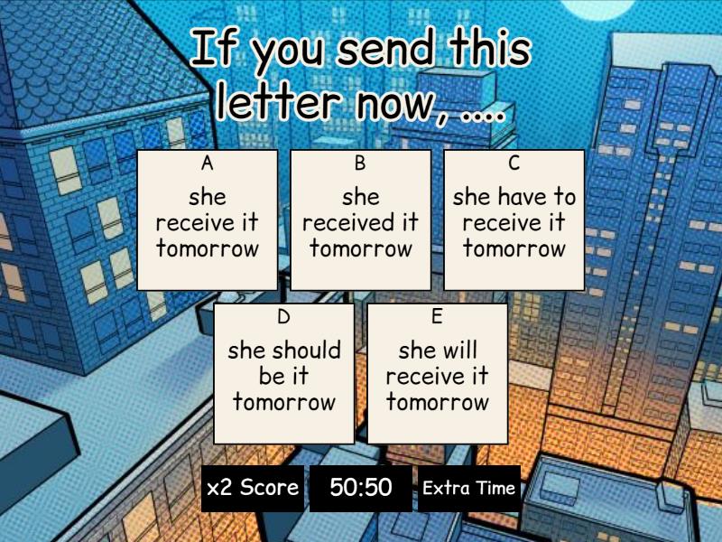 1) If you send this letter now, .... a) she receive it tomorrow b) she received it tomorrow c) she have to receive it tomorrow d) she should be it tomorrow e) she will receive it tomorrow 2) If...., I will get something to eat. a) I was hungry b) Iam hungry c) I are hungry d) I will hungry e) I will be hungry 3) If I ....time tonight, I will finish the novel that I am reading. a) will have b) am having c) have d) has e) am 4) If he calls me "lazy" again, I ________ help him when he is in trouble. a) won't b) don't c) am d) can't e) was 5) If David ________ answer my phone this time I ________ call him again. a) won't / doesn't b) doesn't / won't c) won't / don't d) isn't / won't e) aren't/don't 6) If you eat to much junk food you ____________ fatter. a) will become b) become c) are becoming d) became e) becomes 7) If you __________ by plane it ____________ 2 hours. a) are going / will take b) go / will take c) will go / take d) won't go / don't take e) goes/will take 8) What is wrong with this sentence? "My uncle will buy a car if he have enough money." a) "will buy" must be "buy" b) "have" must be "has" c) "have" must be "will have" d) "will buy" must be "buys" e) "will buy" must be would be 9) I will leave early ______________________. a) if I will finish my work b) If I am finish my work c) if I finish my work d) if I won't finish my work e) If  I finished my work 10) The policeman will tell you the way if you .... him. a) asks b) asked c) will ask d) may ask e) ask 11) If Tom.... this string, he will open the box. a) pull b) pulled c) pulls d) will pull e) may pull 12) If you eat an ice-cream, I will .... a hot chocolate. a) has b) have c) had d) had had e) have been 13) If you .... .... to go out, I'll cook dinner at home. a) doesn't want b) wanted c) don't want d) didn't want e) wants 14) She’ll take a taxi if it .... a) rain b) rained c) rains d) raining e) will rain 15) I .... .... if you don't come with me. a) go b) goes c) wouldn't go d) won't go e) will went 16) If the weather .... ...., we won't have a picnic. a) didn't improve b) improved c) won't improve d) don't improve e) doesn’t improve 17) If we don’t see each other tomorrow, we.... .... each other next week. a) will see b) sees c) would see 18) If we .... all this cake, we'll feel sick a) eat b) ate c) eats d) will eat e) has eaten 19) She.... .... dinner if you go to the supermarket. a) cooked b) will cook c) would cook d) cook e) was cooking 20) She’ll stay in London if she .... a job. a) got b) get c) will get d) gets e) would get