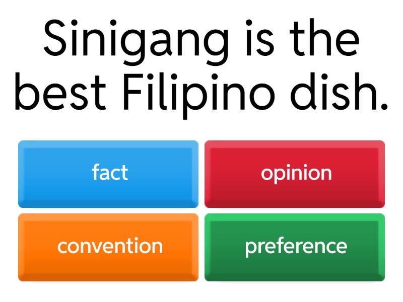 1) Sinigang is the best Filipino dish. a) fact b) opinion c) convention d) preference 2) Jose Rizal was executed at Bagumbayan (now Luneta) on December 30, 1896. a) fact b) opinion c) convention d) preference 3) The Philippines declared independence from Spain on June 12, 1898. a) fact b) opinion c) convention d) preference 4) I prefer wearing Barong Tagalog over a suit for formal occasions. a) fact b) opinion c) convention d) preference 5) The jeepney is a common mode of transportation in the Philippines. a) fact b) opinion c) convention d) preference 6) One of the effects of excessive greenhouse gases is global warming. a) factual b) opinion c) convention d) preference 7) It is better to cheat that to repeat. a) fact b) opinion c) convention d) preference 8) Fasting is a way for the Indians to express their gratitude to their gods and goddesses. a) fact b) opinion c) convention d) preference 9) Euthanasia should be legalized in every country as it is only aims to aid people who experience too much suffering. a) fact b) opinion 10) Cyberbullying is the most prevalent problem in the world right now. a) fact b) opinion