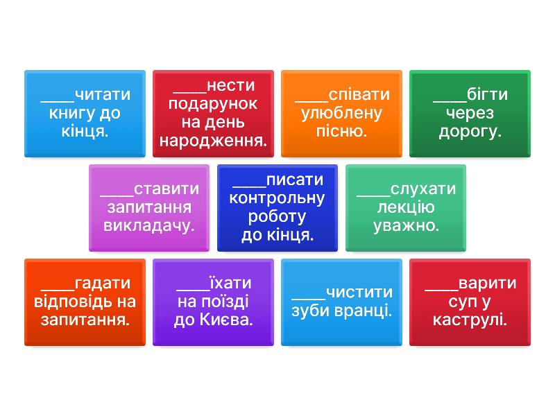 ____бігти через дорогу. - Перебігти через дорогу., ____писати контрольну роботу до кінця. - Дописати контрольну роботу до кінця., ____нести подарунок на день народження. - Принести подарунок на день народження., ____слухати лекцію уважно. - Дослухати лекцію уважно., ____гадати відповідь на запитання. - Відгадати відповідь на запитання., ____співати улюблену пісню. - Заспівати улюблену пісню., ____чистити зуби вранці. - Почистити зуби вранці., ____їхати на поїзді до Києва. - Приїхати на поїзді до Києва., ____варити суп у каструлі. - Зварити суп у каструлі., ____ставити запитання викладачу. - Поставити запитання викладачу., ____читати книгу до кінця. - Прочитати книгу до кінця.,