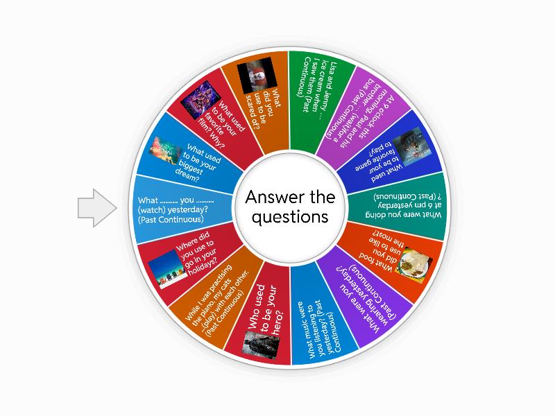 1) What used to be your biggest dream? 2) What used to be your favorite film? Why? 3) What did you use to be scared of? 4) Lisa and Jenny … ice cream when I saw them (Past Continuous) 5) At 9 o'clock this morning, Paul and his brother … (wait)for a bus (Past Continuous) 6) What used to be your favorite game to play? 7) What were you doing at 6 pm yesterday ? (Past Continuous) 8) What food did you use to like the most? 9) What were you wearing yesterday? (Past Continuous) 10) What music were you listening to yesterday? (Past Continuous) 11) Who used to be your hero? 12) While I was practising the piano, my cats ...(play) with each other. (Past Continuous) 13) Where did you use to go in your holidays? 14) What .......... you .......... (watch) yesterday? (Past Continuous)