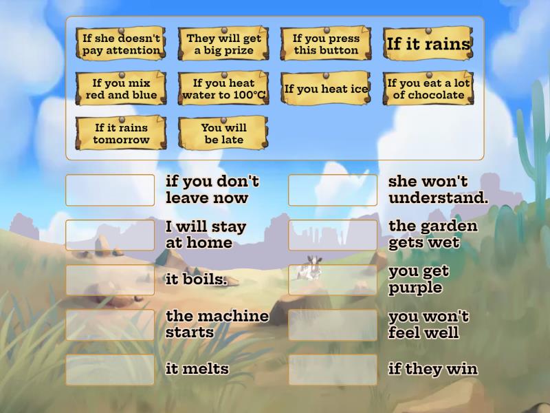 If you press this button - the machine starts, If you heat water to 100°C - it boils., If it rains - the garden gets wet, If you heat ice - it melts, If you mix red and blue - you get purple, If you eat a lot of chocolate - you won't feel well, You will be late - if you don't leave now, If it rains tomorrow - I will stay at home, They will get a big prize - if they win, If she doesn't pay attention - she won't understand.,