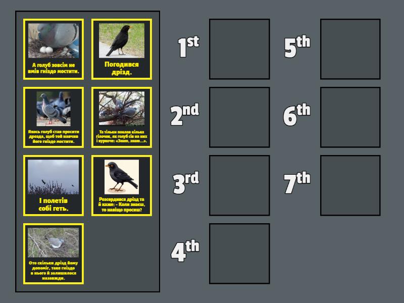 Якось голуб став просити дрозда, щоб той навчив його гніздо мостити., Погодився дрізд., Та тільки поклав кілька гілочок, як голуб сів на них і вуркоче: «Знаю, знаю...»., Розсердився дрізд та й каже: - Коли знаєш, то навіщо просиш?, І полетів собі геть., А голуб зовсім не вмів гніздо мостити., Ото скільки дрізд йому допоміг, таке гніздо в нього й залишилося назавжди..