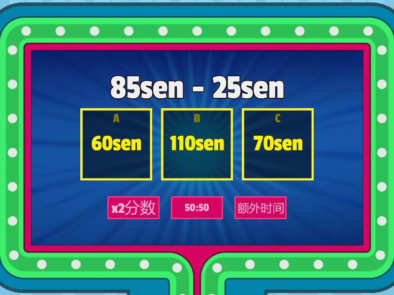 1) 85sen - 25sen a) 60sen b) 110sen c) 70sen 2) RM76 - RM34 a) RM40 b) RM41 c) RM42 3) RM60.90 - RM18.50 a) RM58.40 b) RM42.40 c) RM52.40 4) RM0.60 - RM0.35 a) RM0.45 b) RM0.25 c) RM0.35 5) RM94.70 - RM63.80 a) RM30.90 b) RM31.10 c) RM31.90 6) RM70 - RM65.90 a) RM14.10 b) RM4.10 c) RM5.10 7) RM80 - RM69.90 a) RM10.10 b) RM 20.90 c) RM21.90 8) RM80 - RM38 a) RM52 b) RM42 c) RM62 9) 135sen - 78sen a) 67sen b) 87sen c) 57sen 10) RM61.35 - RM14.90 a) RM57.45 b) RM56.45 c) RM46.45 11) 95sen - 35sen a) 60sen b) 65sen c) 70sen 12) RM67 - RM35 a) RM42 b) RM32 c) RM52 13) RM81.40 - RM29.50 a) RM62.10 b) RM51.10 c) RM51.90 14) RM8.10 - RM2.75 a) RM5.35 b) RM6.65 c) RM6.85 15) RM63.40 - RM39.70 a) RM36.30 b) RM23.70 c) RM33.30 16) RM95.30 - RM4.30 a) RM91 b) RM90 c) RM99.60 17) RM74 - RM39 a) RM35 b) RM45 c) RM55 18) 190sen - 65sen a) 135sen b) 125sen c) 115sen 19) RM56.60 - RM6.90 a) RM50.30 b) RM50.70 c) RM49.70
