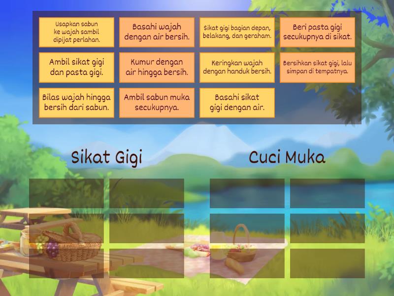 Sikat Gigi: Ambil sikat gigi dan pasta gigi., Beri pasta gigi secukupnya di sikat., Basahi sikat gigi dengan air., Sikat gigi bagian depan, belakang, dan geraham., Kumur dengan air hingga bersih., Bersihkan sikat gigi, lalu simpan di tempatnya., Cuci Muka: Basahi wajah dengan air bersih., Ambil sabun muka secukupnya., Usapkan sabun ke wajah sambil dipijat perlahan., Bilas wajah hingga bersih dari sabun., Keringkan wajah dengan handuk bersih.,