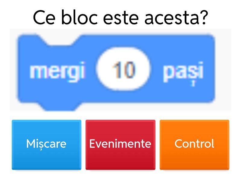 1) Ce bloc este acesta? a) Mișcare b) Evenimente c) Control 2) Ce culoare au blocurile meniului Aspect a) roșu b) verde c) violet 3) Care bloc decide dacă se execută o acțiune sau alta? a) schimbă efectul b) dacă ... atunci c) spune 4) Ce culoare au blocurile din categoria Mișcare în Scratch, folosite pentru a deplasa personajele ? a) verde b) albastru închis c) mov d) portocaliu 5) Ce rol principal au blocurile din categoria Detectare (Albastru deschis)? a) schimbă costumul (aspectul) personajui b) execută operații aritmetice simple c) înregistrează și redă sunete d) detectează interacțiunile cu utilizatorul sau mediul (atingere, întrebări, cronometru) 6) Dacă doriți să calculați suma a două numere sau să verificați o condiție logică (de exemplu, dacă 5 > 3), ce categorie de blocuri de culoare verde veți folosi? a) extensii b) variabile c) sunet d) operatori