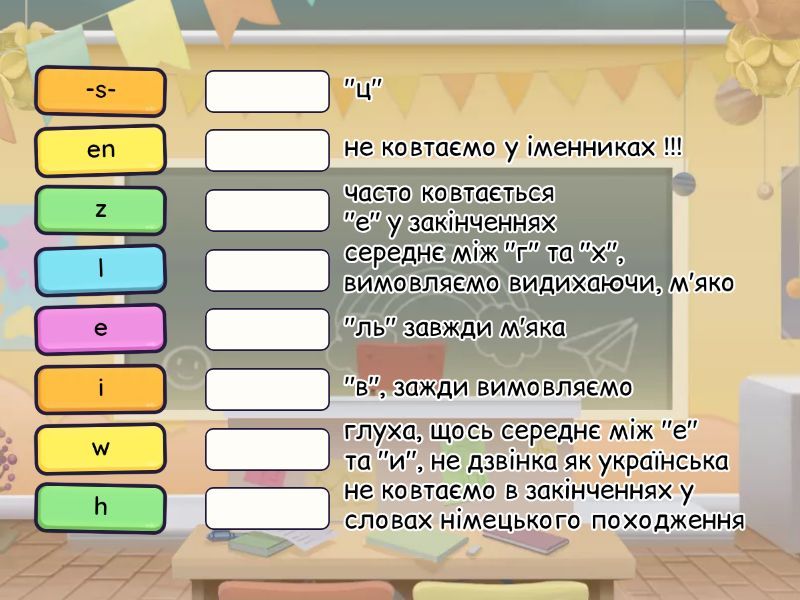e - не ковтаємо в закінченнях у словах німецького походження , i - глуха, щось середнє між "е" та "и", не дзвінка як українська, z - "ц", -s- - не ковтаємо у іменниках !!! , en - часто ковтається "е" у закінченнях, l - "ль" завжди м'яка, w - "в", зажди вимовляємо, h - середнє між "г" та "х", вимовляємо видихаючи, м'яко,