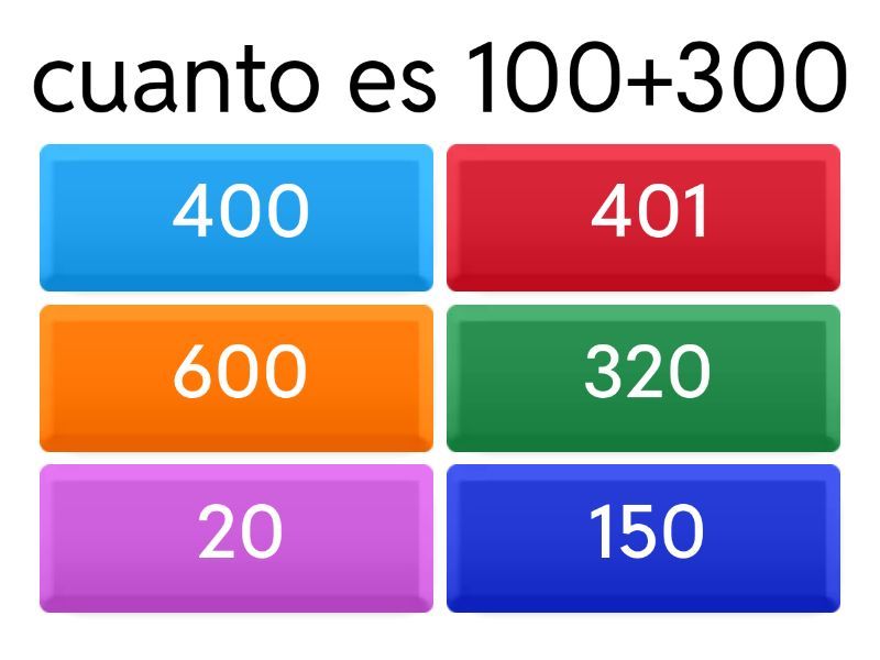 1) cuanto es 100+300 a) 400 b) 401 c) 600 d) 320 e) 20 f) 150 2) que animal es del agua a) el perro b) la ballena c) el gato d) la paloma 3) de que color es el tallo de los arboles a) azul b) rosado c) verde d) morado e) naranja f) cafe 4) es que año fue la primera guerra mundial a) 1914 b) 2025 c) 1932 d) 1918 5) cuantos años tiene la iglesia a) 1900 años b) 2000 años c) 1918 años d) 1998 años