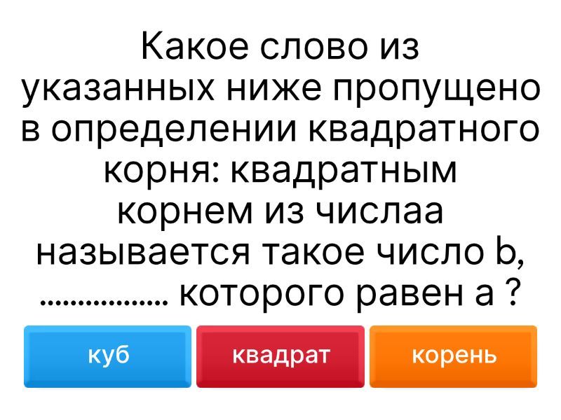 1) Какое слово из указанных ниже пропущено в определении квадратного корня: квадратным корнем из числаа называется такое число b, ................. которого равен а ? a) куб b) квадрат c) корень 2) Какое слово пропущено в определении арифметического квадратного корня: арифметическим квадратным корнем из числа а называется ......... число b, квадрат которого равен а? a) простое b) дробное c) положительное 3) Вычислите: √0,0025 a) 0,05 b) 0,125 c) 0,0125 4) Вычислите: √490000 a) 70 b) 700 c) 70000 5) Вычислите: √36+√121 a) 19 b) 17 c) 15 6) Вычислите: √25 − √0,49 a) 4,61 b) 5,7 c) 4,3 7) Вычислите: √3,2 ⋅√5 a) 0,4 b) 0,16 c) 16 d) 4 8) Вычислите: √7,5 ⋅ √0,3 a) 0,25 b) 5 c) 2,5 d) 1,5 9) Вычислите: √75 ⋅ √5 / √15 a) 5,5 b) 10 c) 4,5 d) 5 10) Число 0,4 является арифметическим квадратным корнем из числа a) 1,6 b) 0,8 c) 0,16