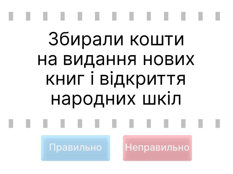 Правильно: Збирали кошти на видання нових книг і відкриття народних шкіл, Писали наукові праці й виступали з лекціями в навчальних закладах Київа, Розповсюджувли антиурядові твори, готували прокламації, Неправильно: Налагоджували зв"язки з польським революційним рухом, Готувалися до організації збройного повстання в Україні, Заснували перший український професійний театр, Залучали до діяльності Греко-котолицьких священників,