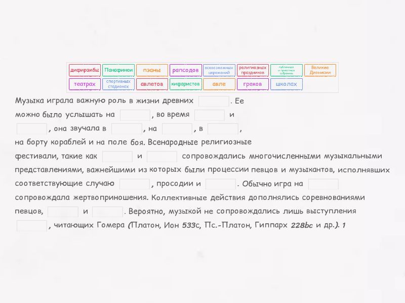 Музыка играла важную роль в жизни древних ____. Ее можно было услышать на ____, во время ____ и ____, она звучала в ____, на ____, в ____, на борту кораблей и на поле боя. Всенародные религиозные фестивали, такие как ____ и ____ сопровождались многочисленными музыкальными представлениями, важнейшими из которых были процессии певцов и музыкантов, исполнявших соответствующие случаю ____, просодии и ____. Обычно игра на ____ сопровождала жертвоприношения. Коллективные действия дополнялись соревнованиями певцов, ____ и ____. Вероятно, музыкой не сопровождались лишь выступления ____, читающих Гомера (Платон, Ион 533с, Пс.-Платон, Гиппарх 228bc и др.). 1 Игрой на ____ или другом подобном инструменте сопровождалось исполнение сочинений Алкея, Сапфо и других «лирических» поэтов, причем поэт либо сам аккомпанировал себе, либо пел под музыкальное сопровождение (как показано на нескольких вазах из Берлина и Афин). Хоровая лирика со времен Алкмана должно быть также сопровождалась игрой на ____ или кифаре. Не вполне ясно, исполнялись ли под музыку элегии (свидетельство Феогнида на этот счет истолковывается по-разному), однако несомненно, что авл сопровождал исполнение ____, которые писались тем же размером, что и ____. В отличие от ____, который появляется не ранее ΙΙΙ в. до н. э., ____ представлял собой чашеобразный резонатор ок. 30–40 см. диаметром, обтянутый кожей. Держали тимпан обычно в левой руке и ударяли по мембране пальцами правой руки или ладонью (Рис. 22). На некоторых иллюстрациях (как на вазе из Британского музея) игрок ударяет по оборотной украшенной стороне тимпана: давление воздуха внутри резонатора заставляет кожаную мембрану издавать глухой низкий звук. Деревянные трещотки ____ изображаемые на вазах классического периода всегда парами, использовались танцовщицами. На одном изображении направляющийся на выступление артист несет авл в чехле и пару трещоток для своей партнерши. ____ (kymbala) также использовались во время танца и звучали как маленькие ____. Сохранилось несколько образцов (Рис. 4, 23 и 24). Syrinx (лат. fistula), ____, известен людям с древности. Согласно античным описаниям, инструмент представлял собой набор из семи полых ____ одинаковой длины, заполненных пчелиным воском и им же склеенных. Вероятно, трубки располагались в ____. Наиболее ранее изображение – ваза ок. 575 г. до н. э. (François Vase), где на сиринге играет одна из муз на свадьбе Пелея и Фетиды (ср. Еврипид, Ифигения в Авлиде 1036 сл). Оригинальный духовой инструмент, ____, встречается на изображениях в публичном контексте (в редких случаях – на пирах). Инструмент кардинально отличается от рога или ____ позднейших времен: он представляет собой ____ длиной ок. 1 м постоянного диаметра с раструбом на конце. В трактате Аристотелевского корпуса О слышимом (803а) говорится, что при легком вдохе салпинг мог издавать ____, а при сильном – ____. На уникальном изображении из Элевсины начала V в. до н. э. (Pöhlmann–West 2001 (DAGM), no. 1) описан звук этого инструмента: to-tē-to-to-te. Примечательно, что игрок использовал приспособление для крепления инструмента в виде повязки (phorbeia), аналогичное тому, что используется при игре на ____ Гомер не упоминает боевые трубы (кроме Ил. 18, 219, где сигнал предупреждает о приближении пиратов). Появление ____ (как и тимпана) в Греции связывается с приходом культа ____ (вероятно, из Малой Азии). Первые греческие изображения авла засвидетельствованы на саркофа