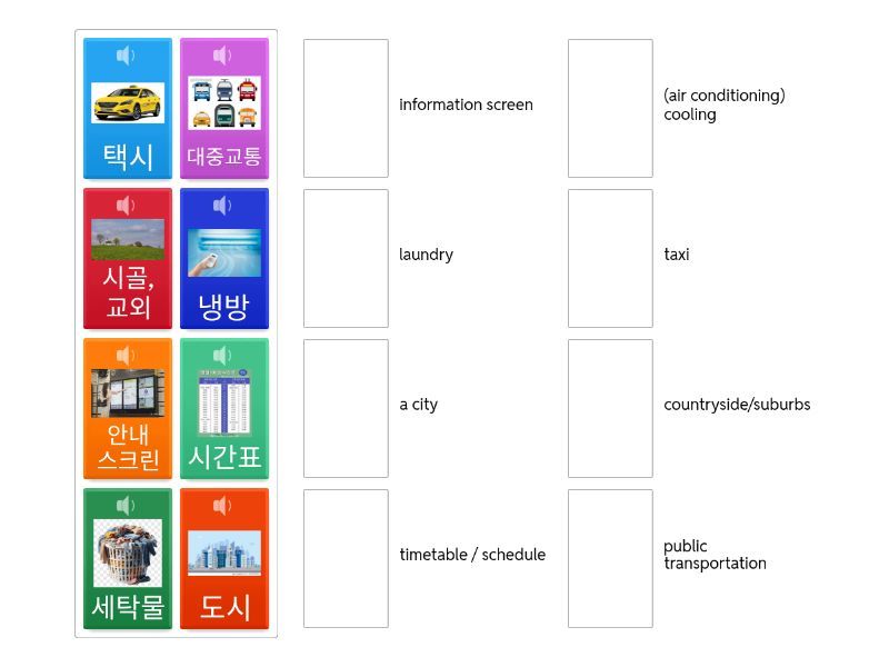 도시 - a city, 시골, 교외 - countryside/suburbs, 뉴욕 - New York, 쇼핑몰 - a shopping mall, 편의점 - convenience store, 나무 - tree, 라면 - instant noodles (ramyeon), 세탁물 - laundry, 반려동물 - pets, 쥐 - a mouse/rat, 택시 - taxi, 버스 - bus, 지하철 - subway, 기차 - train, 킥보드 - kick scooter, 대중교통 - public transportation, 교통카드 - transit card used to pay fares, 시간표 - timetable / schedule, 스크린 도어, 안전문 - platform screen doors for safety at subway stations, 안내 스크린 - information screen, 냉방 - (air conditioning) cooling, 약냉방 - (air conditioning) gentle cooling, 난방 - heating (to make a space warm),
