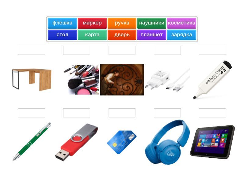 вода, планшет, тетрадь, словарь, наушники, деньги, ключи (ключ), флешка, телефон, зарядка, ручка, паспорт, косметика, очки, карта, карандаш, фотография, зонт, зонтик, стол, стул, доска, билет, кошелёк, маркер, часы, письмо, окно, дверь, компьютер, ноутбук,
