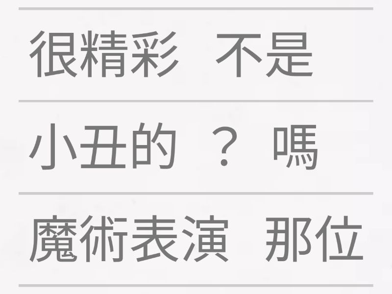 那位 小丑的 魔術表演 不是 很精彩 嗎 ?, 小明 生病了 , 怎麼 能夠 參加 明天的 音樂 表演呢 ?, 哥哥 已經 成年了 , 難道 他 不能 照顧自己 嗎 ?, 我 只是 小學生 , 怎能 計算出 這道 數學 難題 嗎? , 現在 已經 夜深了 , 怎會 有藥房 營業 呢 ?, 弟弟 的 右手 受傷了 , 怎麼 可以 拿 重物 呢 ? ,