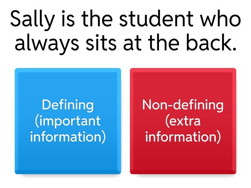 1) Sally is the student who always sits at the back. a) Defining (important information) b) Non-defining (extra information) 2) The woman who lives next door is a doctor. a) Defining (important information) b) Non-defining (extra information) 3) My brother who lives in Kharkiv is an architect. a) Defining (important information) b) Non-defining (extra information) 4) Grace works for the company which makes furniture. a) Defining (important information) b) Non-defining (extra information) 5) We know a lot of people who live in the city. a) Defining (important information) b) Non-defining (extra information) 6) We stayed at the Park Hotel which our friends recommended. a) Defining (important information) b) Non-defining (extra information) 7) An architect is someone who designs buildings. a) Defining (important information) b) Non-defining (extra information) 8) Ian, who can speak French and Italian, works as an actor. a) Defining (important information) b) Non-defining (extra information) 9) What was the name of the person who phoned? a) Defining (important information) b) Non-defining (extra information) 10) Where is the cheese that was in the fridge? a) Defining (important information) b) Non-defining (extra information) 11) Kate has just been to Rome where her daughter lives. a) Defining (important information) b) Non-defining (extra information) 12) The new stadium which can hold 90,000 people will be built next year. a) Defining (important information) b) Non-defining (extra information) 13) I don’t like stories that have unhappy endings. a) Defining (important information) b) Non-defining (extra information)