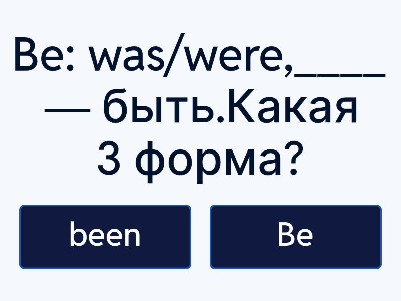 1) Be: was/were,____ — быть.Какая 3 форма? a) been b) Be 2) ____: went, gone — идти.Какая 1 форма? a) gone b) go 3) See: saw,____ — видеть.Какая 3 форма? a) saw b) seen 4) Have:____ had — иметь.Какая 2 форма? a) Have b) had 5) Ride: rode,____ — ездить (верхом).Какая 3 форма? a) ridden b) rode 6) ____ -drew, drawn — рисовать.Какая 1 форма? a) drew b) Draw 7) Eat: ate,____ — есть.Какая 3 форма? a) eaten b) eat 8) Make: ____, made — делать своими руками, мастерить.Какая 2 форма? a) make b) made 9) Write: wrote, ____ — писать.Какая 3 форма? a) written b) wrote 10) Drink: ____, drunk — пить.Какая 2 форма? a) drink b) drank 11) ____: bought, bought — покупать.Какая 1 форма? a) bought b) Buy 12) Sing: sang, ____ — петь.Какая 3 форма? a) sung b) sing 13) ____: left, left — уходить, покидать.Какая 1 форма? a) left b) Leave 14) Give: gave, ____ — давать.Какая 3 форма? a) given b) give 15) ____: met, met — встречать, знакомиться.Какая 1 форма? a) met b) Meet 16) Come: ____, come — приходить.Какая 2 форма? a) come b) came 17) ____: said, said — говорить.Какая 1 форма? a) Say b) said 18) ____: thought, thought — думать.Какая 1 форма? a) thought b) Think 19) Win: won, ____ — побеждать.Какая 3 форма? a) won b) win 20) Sleep: ____, slept — спать.Какая 2 форма? a) slept b) sleep 21) Take: took, ____ — брать.Какая 3 форма? a) took b) taken 22) ____: swam, swum — плавать.Какая 1 форма? a) swam b) Swim 23) Run: ran, ____ — бегать.Какая 3 форма? a) run b) ran 24) Become: ____, become — становиться.Какая 2 форма? a) become b) became 25) ____: began, begun — начинать.Какая 1 форма? a) Begin b) began 26) Break: broke, ____ — ломать.Какая 3 форма? a) break b) broken 27) ____: brought, brought — приносить.Какая 1 форма? a) Bring b) brought 28) Build: ____, built — строить.Какая 2 форма? a) build b) built 29) ____: caught, caught — ловить.Какая 1 форма? a) caught b) Catch 30) Choose: chose, ____ — выбирать.Какая 3 форма? a) chosen b) chose 31) Cost: ____, cost — стоить.Какая 2 форма? a) cast b) cost 32) ____: cut, cut — резать.Какая 1 форма? a) cute b) cut 33) Do: did, ____ — делать.Какая 3 форма? a) done b) did 34) Drive: ____, driven — быть за рулём.Какая 2 форма? a) drive b) drove 35) Fall: fell,____ — падать.Какая 3 форма? a) fallen b) fell 36) ____: fed, fed — кормить.Какая 1 форма? a) fed b) Feed 37) Fight: fought,____ — драться, бороться.Какая 3 форма? a) fought b) fight 38) Find:____ found — искать.Какая 2 форма? a) found b) find 39) ____: flew, flown — летать.Какая 1 форма? a) flew b) Fly 40) Get: got, ____ — получать.Какая 3 форма? a) got b) get 41) ____: grew, grown — расти, выращивать.Какая 1 форма? a) grew b) Grow 42) Hear: ____, heard — слышать.Какая 2 форма? a) heard b) hear 43) Hide: hid, ____ — прятать(ся), скрывать.Какая 3 форма? a) hidden b) hid 44) Hit: hit, ____— ударять.Какая 3 форма? a) hit b) hite 45) ____: kept, kept — хранить, сохранять, поддерживать.Какая 1 форма? a) kept b) Keep 46) Know: ____, known — знать. Какая 2 форма? a) know b) knew 47) leave-left-____ - уходить, покидать. Какая 3 форма? a) left b) leave 48) • let-let-___ - позволять, разрешать. Какая 3 форма? a) lete b) let 49) • lose-____-lost - терять Какая 2 форма? a) lost b) list 50) • ____-paid-paid - платить Какая 1 форма? a) paid b) pay 51) • put-put-____ - класть, ставить, помещать Какая 3 форма? a) put b) pute 52) • ____/ri:d/-/red/-/red/ - читать Какая 1 форма? a) red b) read 53) • sell-____-sold - продавать Какая 2 форма? a) sold b) sell 54) • ____-sent-sent - посылать, отправлять Какая 1 форма? a) sent b) send 55) • ring-rang-____ - звенеть, звонить Какая 3 форма? a) rung b) rang 56) • rise-rose-____ - восходить, вставать, подниматься Какая 3 форма? a) rise b) risen 57) • ____-shone-shone - сиять, светить Какая 1 форма? a) shene b) shine 58) • sit-sat-___ - сидеть, садиться Какая 3 форма? a) sit b) sat 59) • spend-____-spent - тратить Какая 2 форма? a) spent b) spend 60) • ____-stood-stood - стоять Какая 1 форма? a) stood b) stand 61) • take-took-____ - брать Какая 3 форма? a) taken b) took 62) • teach-____-taught - учить Какая 2 форма? a) taught b) teach 63) • tell-told-____ - рассказывать Какая 3 форма? a) tell b) told 64) • ____-woke-woken - просыпаться, будить Какая 1 форма? a) woke b) wake 65) • wear-____-worn - носить (одежду) Какая 2 форма? a) wore b) wear