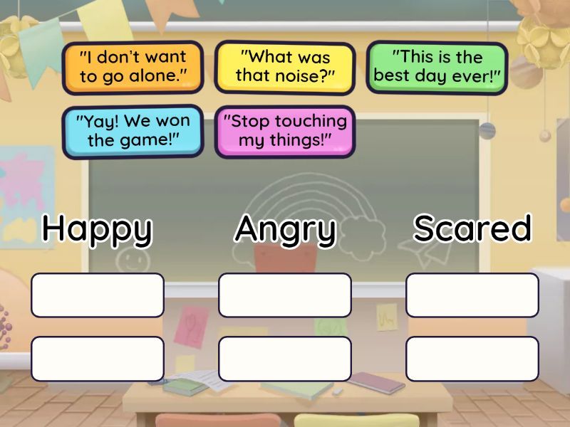 Happy: "Yay! We won the game!", "This is the best day ever!", Angry: "Stop touching my things!", Scared: "What was that noise?", "I don’t want to go alone.",