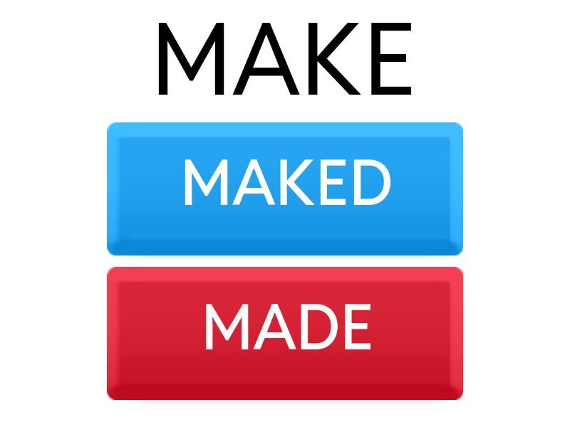 1) MAKE a) MAKED b) MADE 2) TAKE a) TOOK b) TAKED 3) EAT a) EATED b) ATE 4) BUY a) BUYED b) BOUGHT 5) READ a) READED b) READ 6) HAVE a) HAVED b) HAD 7) SEE a) SEED b) SAW 8) DRIVE a) DRIVED b) DROVE 9) MEET a) MEETED b) MET 10) GO a) WENT b) GOED
