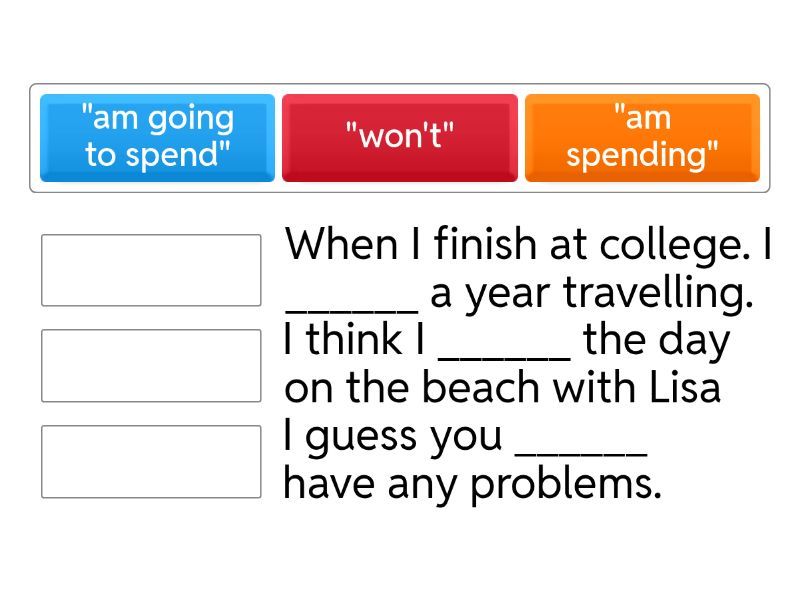 "am spending" - I think I ______ the day on the beach with Lisa, "am going to spend" - When I finish at college. I ______ a year travelling., "won't" - I guess you ______ have any problems.,