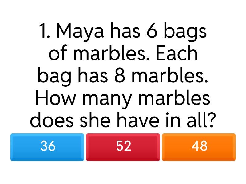 1) 1. Maya has 6 bags of marbles. Each bag has 8 marbles. How many marbles does she have in all? a) 36 b) 52 c) 48 2) 2. A farmer picks 12 baskets of apples. Each basket has 5 apples. How many apples did the farmer pick? a) 60 b) 55 c) 45 3) Liam buys 4 packs of markers. Each pack has 12 markers. How many markers does he have in all? a) 57 b) 47 c) 48 4) A garden has 5 rows of flowers. Each row has 13 flowers. How many flowers are there? a) 65 b) 70 c) 55 5) A classroom has 27 students. Each student needs 6 sheets of paper for an activity. How many sheets need in total? a) 100 b) 129 c) 162