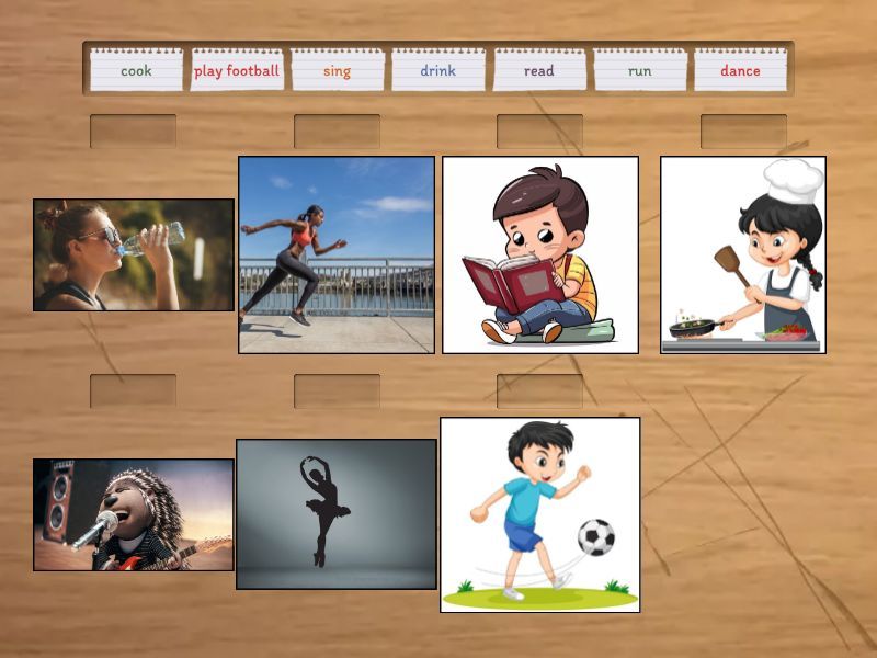 swim, jump, dance, fly, write, read, cook, sing, play football, run, drink, sleep, draw,