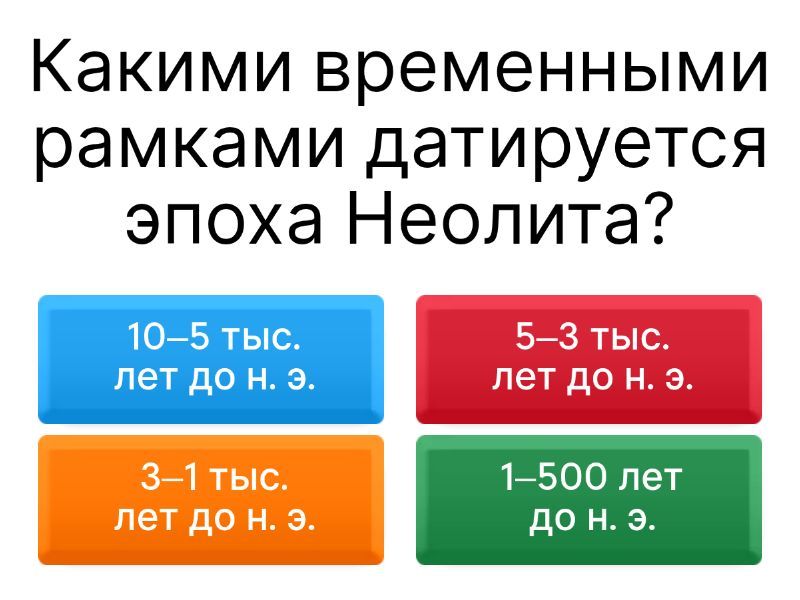 1) Какими временными рамками датируется эпоха Неолита? a) 10–5 тыс. лет до н. э. b) 5–3 тыс. лет до н. э. c) 3–1 тыс. лет до н. э. d) 1–500 лет до н. э. 2) Как переводится слово «Неолит» с греческого? a) Древний камень b) Твердый камень c) Обработанный камень d) Новый камень 3) Какое второе название получила эпоха из-за керамики? a) Эпоха глиняных горшков b) Эпоха медных орудий c) Эпоха великих переселений d) Эпоха железных орудий 4) Сколько неолитических стоянок найдено в Казахстане? a) Более 100 b) Более 300 c) Более 600 d) Более 900 5) Какая стоянка находится у озера Зайсан? a) Усть-Нарым b) Караганда c) Зеленая Балка d) Актас 6) Какое ремесло появилось в неолите? a) Кожевенное дело b) Гончарное дело c) Вязание d) Ткачество (прядение) 7) Где находится стоянка «Зеленая Балка»? a) Кызылординская область b) Центральный Казахстан c) Мангыстау d) Восточный Казахстан 8) Что изображено как символ эпохи? a) Керамические сосуды b) Золотые украшения c) Наскальные рисунки d) Металлические орудия 9) Какое орудие труда изображено внизу? a) Копье b) Мотыга c) Каменный топор d) Лук 10) Какая стоянка расположена западнее? a) Зеленая Балка b) Усть-Нарым c) Они на одной долготе d) Саксаульская