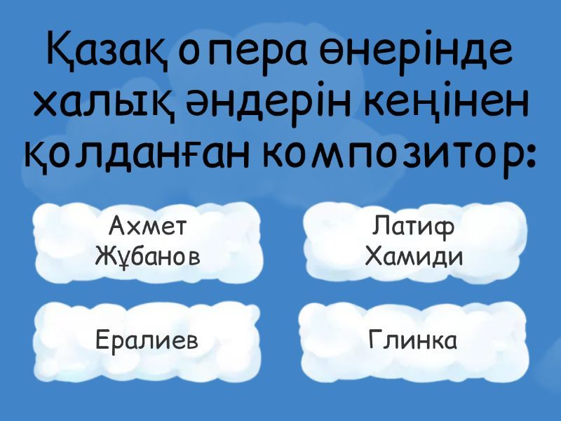 1) Қазақ опера өнерінде халық әндерін кеңінен қолданған композитор: a) Ахмет Жұбанов b) Латиф Хамиди c) Ералиев d) Глинка 2) Абай» операсында халық әндерінің мотивін пайдаланған автор: a) Бейімбет Майлин b) А.Халелұлы c) Л.Хамиди d) Чайковакий 3) Қазақ халық оркестрі құрамына жатпайтын аспап: a) Домбыра b) Саксофон c) Күйші қобыз d) Жаңағы сыбызғы 4) Оркестрді тыңдау кезінде оқушыны нені дамытуға болады? a) Сөздік қорды b) Музыкалық құлақты c) Әдебиеттік қабілетті d) Сурет салу шеберлікті 5) Қазақ композиторларының шығармаларының ерекшелігі: a) Шетелдік халық әуендерін қолдану b) Халық әні мен күй мотивтерін пайдалану c) Синтезаторлық эксперименттер d) Джаз элементтері 6) Қай композици қазақ музыкасына тән? a) Кармен b) Щелкунчик c) Сарыарқа d) Лебединое озеро 7) Музыканы тыңдау барысында оқушылардың қай қабілеті дамиды? a) Логикалық ойлау b) Талдау және сезімталдық c) Физикалық күш d) Жазу дағдылары 8) Қай әдіс шығармашылық қабілетті арттыруға бағытталған? a) Музыканы тыңдау,сезіну және талдау b) Тек нотаны оқу c) Тек орындау d) Фортепианода жаттығу 9) Музыканы талдау кезінде негізгі әдіс: a) Композицияның құрылымын зерттеу b) Тек ән мәтінін оқу c) Сурет салу d) Шығармашылыш жұмыс 10) Музыкалық есту қабілетін дамытуға бағытталған әдіс: a) Көркем сурет салу b) Шет тілін үйрену c) Спорттық ойындар d) Музыканы тыңдау және ритмді анықтау 11) Музыка сабағының негізгі мақсаты қандай? a) Оқущыларды ән айтуға үйрету b) Құралда ойнауды міндеттеу c) Музыка тарихын жаттау d) Музыкалық мәдениетті қалыптастыру 12) Музыкалық тәрбиенің негізгі құралы қайсысы? a) Сурет b) Музыка өнері c) Би d) Әдебиет 13) Музыка тыңдау әдісінің басты мақсаты: a) Музыканы сезіну,қабылдау b) Әнді жатқа айту c) Құралда ойнау d) Ырғақ жазу 14) Дауыс диапазоны дегеніміз не? a) Әннің ұзақтығы b) Әннің тембрі c) Музыка қарқыны d) Дауыс шығатын дыбыстар көлемі 15) Бастауыш сыныпта ән айту әдісі қандай тональдікте жүргізіледі? a) Төмен тональдікте b) Жоғары тональдікте c) Орташа, жеңіл тональдікте d) Тональдік қолданылмайды 16) Музыка пәніндегі «ырғақтық жаттығулардың» мақсаты: a) Әннің мәтінін жаттау b) Дыбыс ұзақтықтарын сезіну c) Құралда ойнау d) Музыка тарихын түсіну 17) Оркестр дегеніміз: a) Әншілер тобы b) Би тобы c) Музыкалық аспаптарда ансамбльдік орындаушылар тобы d) Жалғыз орындаушы 18) Музыка пәнінде қолданылатын көрнекілік түрі: a) Табиғи материалдар b) Химиялық реактивтер c) Геометриялық құралдар d) Музыкалық аспаптар,ноталар 19) Ән айту кезінде дұрыс қалып сақтау не үшін қажет? a) Дауыс еркін шығу үшін b) Тез жаттау үшін c) Қол қимылдарын орындау үшін d) Әдемі көріну үшін 20) Музыка сабағында қолданылатын белсенді әдістердің бірі: a) Шеңберге тұрып ән айту, топтық жұмыс b) Музыкалық лекция тыңдау c) Музыкалық әнді көшіру d) Тест жазу 21) Әуен дегеніміз: a) Тек қана ырғақ b) Дыбыстардың биіктік бойынша қозғалысы c) Музыкалық термин d) Би қозғалысы 22) Музыка сабағындағы шығармашылық жұмысқа жатады: a) Сабақты көшіру b) Орындаушылық,импровизация c) Тақырыпты жаттау d) Сұраққа жауап беру 23) Музыкалық сауаттылық дегеніміз не? a) Музыканы тек тыңдау қабілеті b) Әннің сөзін жаттау c) Музыкалық дыбыстарды, ноталарды және белгілерді түсіну d) Би қимылдарын орындау 24) Нота баспалдағы қалай аталады? a) Гамма b) Темп c) Динамика d) Трактовка 25) Музыкалық жазбаның негізі қайсысы? a) Ән мәтіні b) Би қимылдары c) Нота және кілт d) Әдеби шығарма