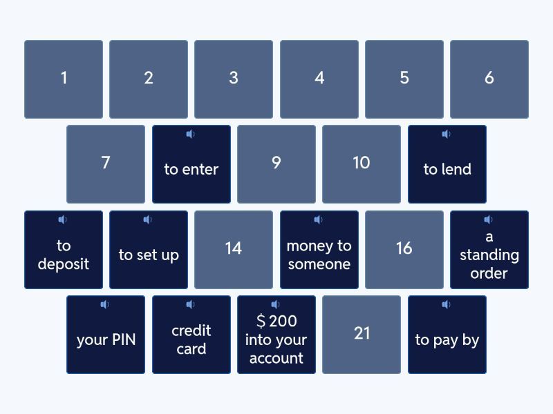 to set up  - a standing order, to pay by  - credit card, to deposit  - $200 into your account, to enter - your PIN, to lend - money to someone, to borrow - money from someone, to withdraw - $150 from your account, to transfer - $300 to another account, to open - a bank account, to renew - your insurance , to put forward - a proposal,