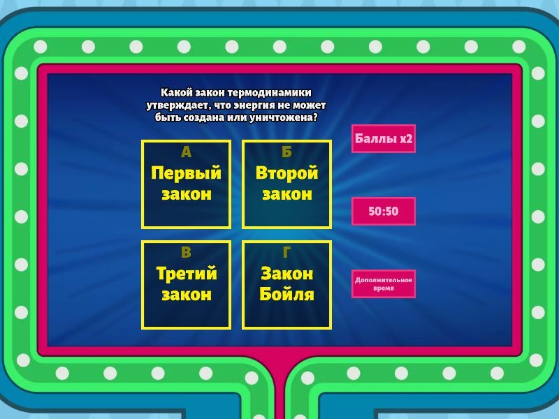 1) Какой закон термодинамики утверждает, что энергия не может быть создана или уничтожена? a) Первый закон b) Второй закон c) Третий закон d) Закон Бойля 2) Что такое КПД? a) Коэффициент давления b) Коэффициент потерь c) Коэффициент полезного действия d) Коэффициент плотности 3) Какой закон термодинамики связан с энтропией? a) Закон Гей-Люссака b) Первый закон c) Третий закон d) Второй закон 4) Какой процесс является изотермическим? a) Давление постоянное b) Температура постоянна c) Объем постоянный d) Энтропия постоянна 5) Какой процесс называется адиабатическим? a) Без изменения температуры b) Без изменения объема c) Без изменения давления d) Без теплообмена 6) Что увеличивается в изобарическом процессе? a) Температура b) Объем c) Давление d) Энтропия 7) Какой закон термодинамики утверждает, что энтропия замкнутой системы не убывает? a) Второй закон b) Первый закон c) Третий закон d) Закон Бойля 8) Какой процесс называется изохорическим? a) Энтропия постоянна b) Температура постоянна c) Давление постоянное d) Объем постоянный 9) Какой закон термодинамики связан с абсолютным нулем температуры? a) Второй закон b) Первый закон c) Третий закон d) Закон Гей-Люссака 10) Что происходит с КПД, если температура нагревателя увеличивается? a) КПД уменьшается b) КПД увеличивается c) КПД не меняется d) КПД обнуляется