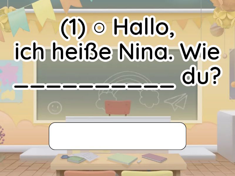 (1) ○ Hallo, ich heiße Nina. Wie __________ du?, (1) ● Ich __________ Emma., (2) ○ Ich bin Julia. Und wer __________ du?, (2) ● Ich __________ Klara., (2) ○ Entschuldigung, wie __________ __________ ? |● Klara., (3) ○ Hallo Klara! Wie __________ ?, (3) ● Danke, __________ . Und ________ ?, (3) ○ __________, danke!.